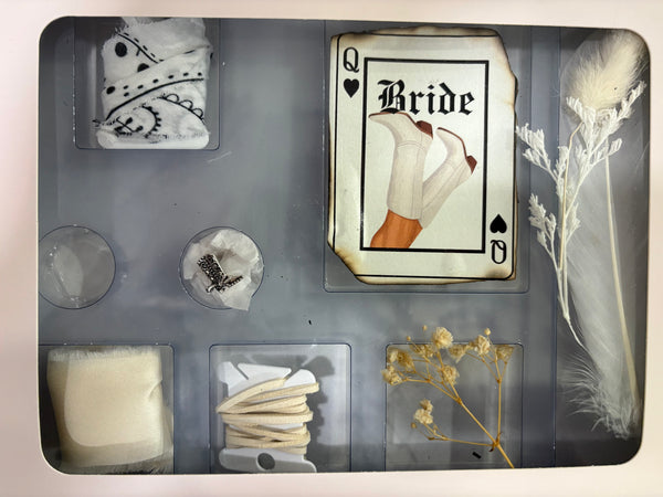 Each kit includes a collection of premium embellishments, textures, and details. From feathers and fabrics to charms, playing-card art, and hand-selected dried florals, every element is chosen to help you design your perfect hat.